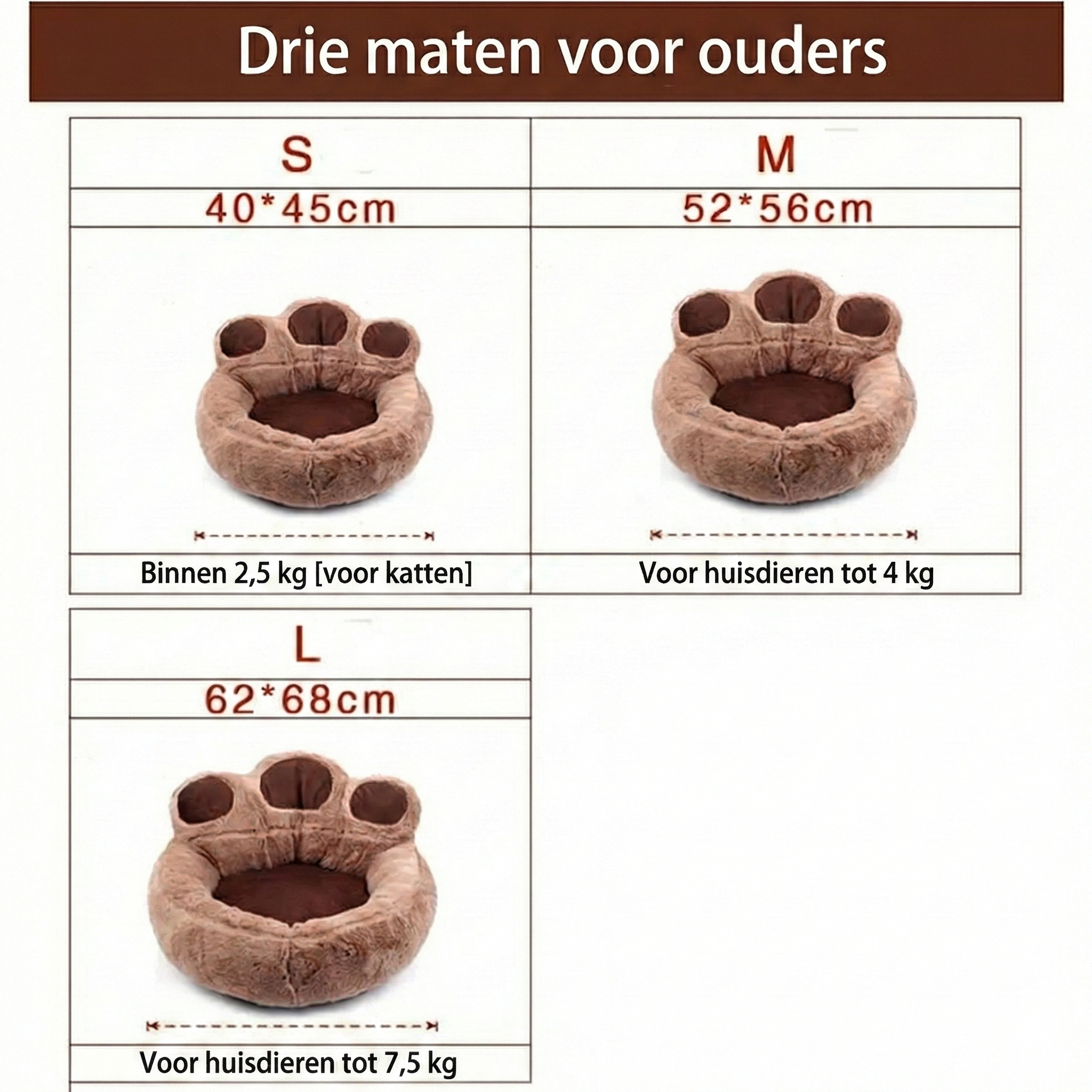 • A: Kijk goed naar het gewicht en de slaaphouding van je dier. Voor kleine katten of pups (tot 2.5kg) is S perfect. Voor grotere katten of kleine honden (tot 4kg) raden we M aan. Heb je een iets grotere hond (bijv. Jack Russell of Mops) tot 7.5kg? Kies dan voor maat L voor extra ruimte.