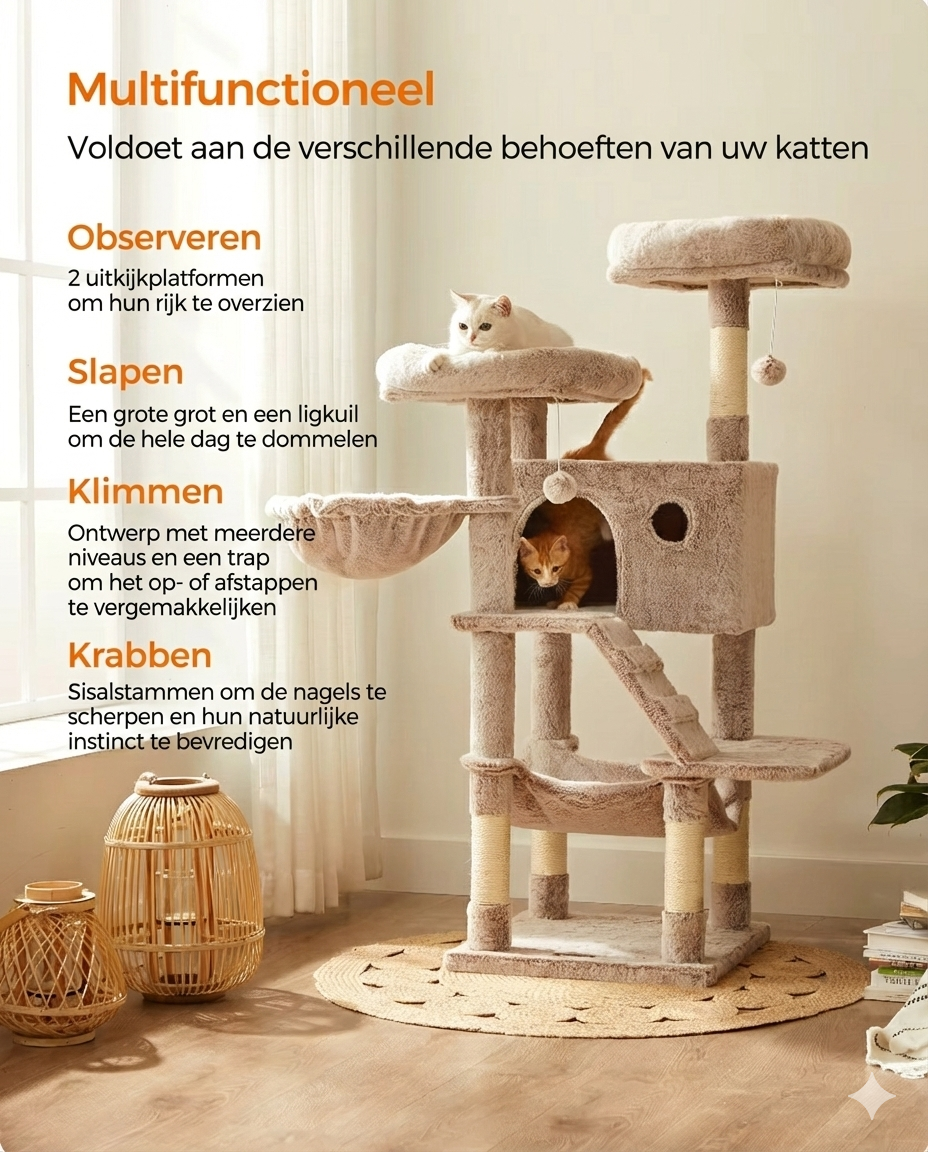 • Uitzichtpunten: Katten zitten graag hoog. De bovenste ligplateaus, bekleed met zacht pluche, bieden het perfecte uitzichtpunt over de woonkamer.